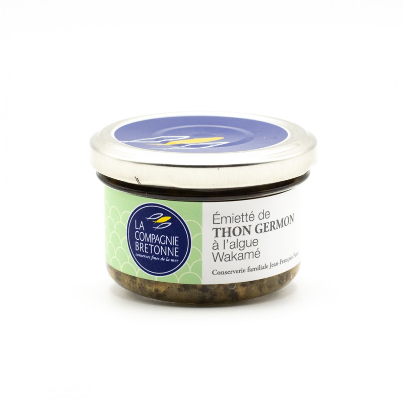 Ingrédients : Thon blanc Germon 25 %, algue Wakamé réhydratée 25 %, oignons, huile d’olive et colza, vinaigre de vin blanc, vin blanc, sel poivre, épices.