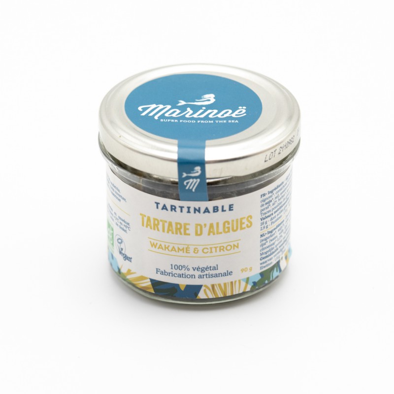 Ingrédients : algues marines* 40 % (dulse, laitue de mer, wakamé), huile d’olive*vierge extra, oignons*, cornichons*, vinaigre de cidre*et de riz*, (eau, riz complet*, sel marin), échalotes*, sauce soja*(eau, graines de soja*, sel), graines de moutarde*, jus de citron* 1 %, persil*, ail*, et herbes*